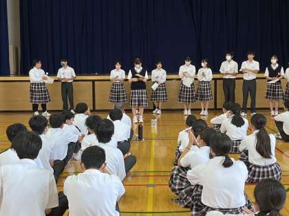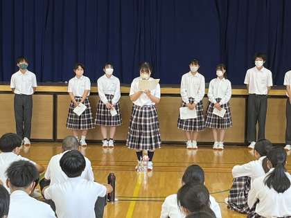 また、クラスで行った1分間スピーチの優秀者に学年集会で発表してもらいました。