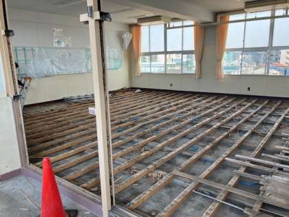 4階と3階の教室の工事は廊下との段差をなくす工事になります。現在床面がすべて剝がされました。