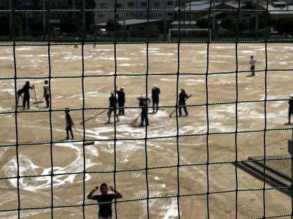 今日は、野球部とソフトテニス部、サッカー部でにがりをグラウンドに撒きました。
