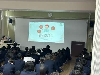 本日、5限目に1年生は「デートDVについて」、ボ・ドームダイヤモンドルームより藤岡果林先生をお招きし、講話を行っていただきました。