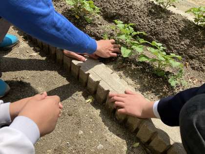 総合学習室で、しんたつ農園にジャガイモを植えています。