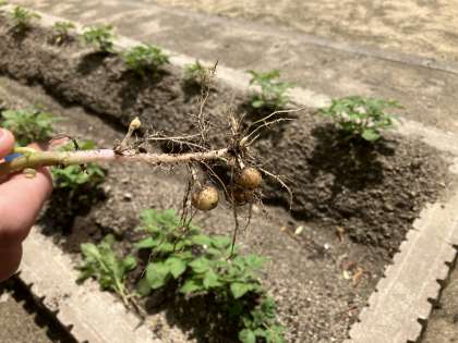 本日は間引きをしました。間引いた先には、小さな小さなジャガイモの赤ちゃんが付いていました。