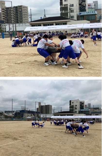 2年生は棒引き、タイヤ引きを3クラス対抗で行いました。