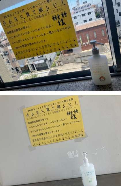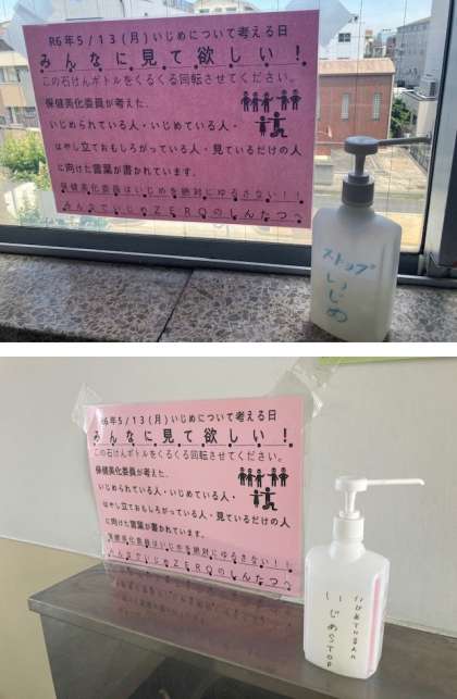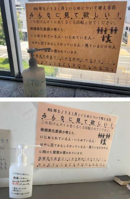 保健美化委員会では、誰もが1日1回は手を洗う、手洗い場に着目し、「石鹸ボトル」にメッセージを書きました。