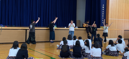 それに先立って、劇団銅鑼(どら)の7名の方々に来ていただき、1年生を対象としたワークショップを行っていただきました。