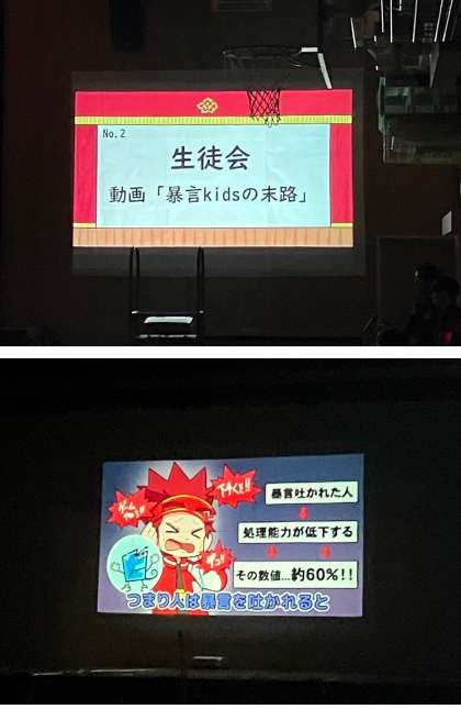 しんたつ生徒会は、5月の「いじめ(いのち)について考える日」の取り組みの中で、「暴言」についてアンケートを行い、アンケート結果を元に、全校生徒に向けて考える取り組みを行っています。