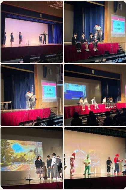 1年生の時に学んだ「e-sports」、(2年生に内容は劇中省略)3年生の体育大会や修学旅行での学びを発表してくれました。