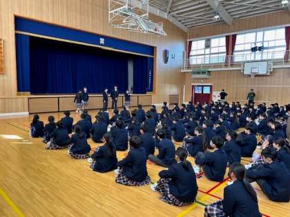 全校集会の後に、先週の生徒専門委員会で話し合ったことを、全校生徒の前で報告してくれました。生徒会では挨拶や授業の過ごし方について、改善していこうと話がありました。校長先生のお話にもあったようにお互いに気持ちよくできる学校が作れるように頑張って行きましょう。