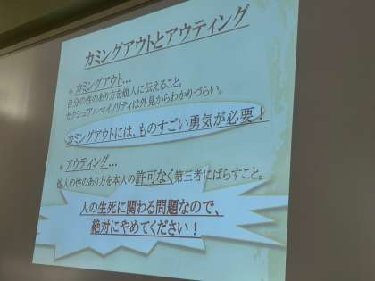 否定はしないで欲しい。また他の人の性を探ったり、勝手に周りの人に言いふらす(アウティング)は、人の死にも直接つながる危険な行為であることを強くお話しいただきました。