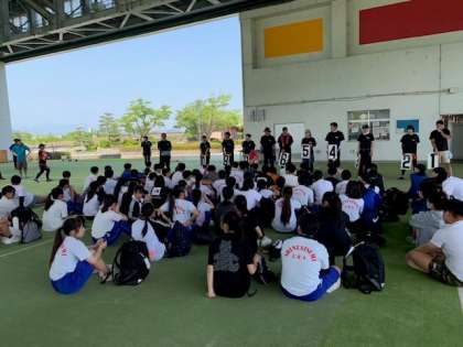 関金町での退村式を終えた49期生一行は、ドラゴンカヌー体験場所の東郷湖に到着しました。