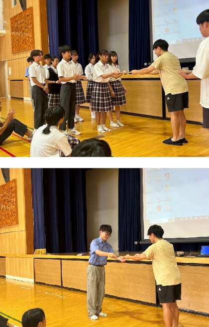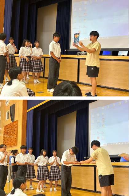 本日2年生は、朝の学年集会で先日のプレゼン発表会の表彰を行いました。