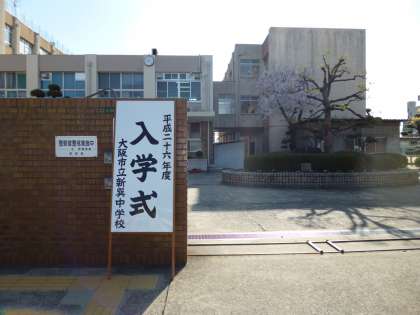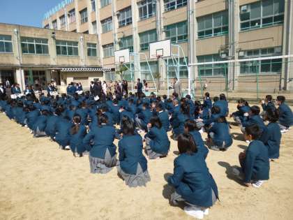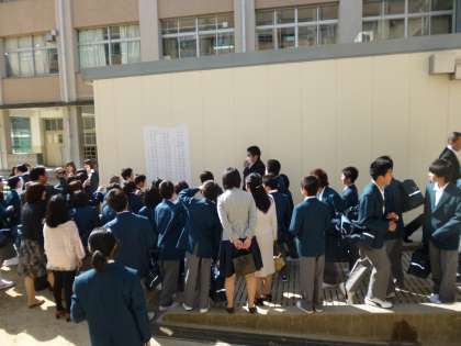 写真はクラス分けの掲示を食い入るように見つめる新入生と保護者の方々の様子と各クラスごとに整列して座り、入学式が進行する予定の説明を真剣に聞いている新入生たちの様子です。