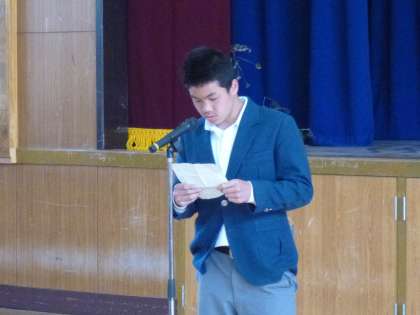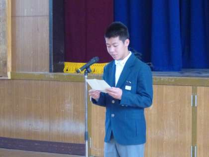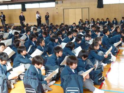 上から、真剣に部活動紹介を聞いている1年生たち、ラグビー部、男子バスケットボール部です。
