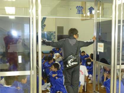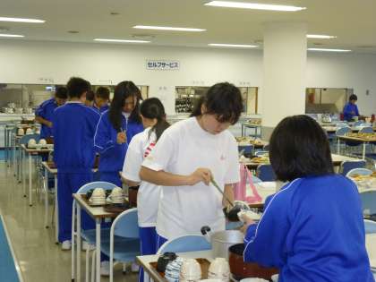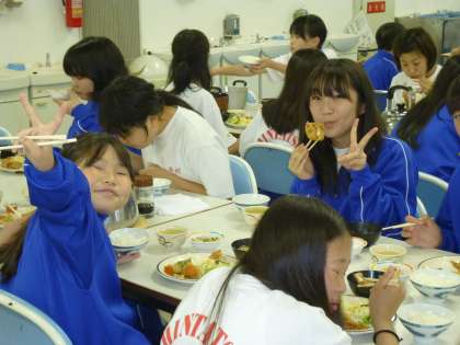 各クラス15分ずつの入浴が終了し、夕食の時間となりました。食事係の準備を行儀よく待っていた1年生たちは、おいしそうに夕食を食べていました。