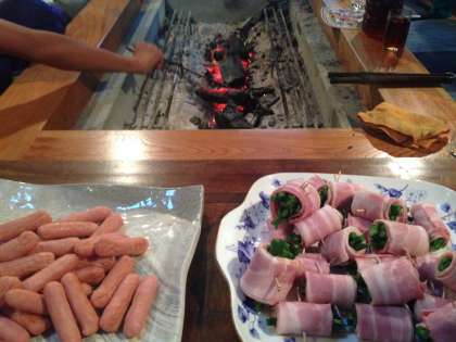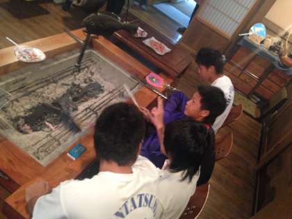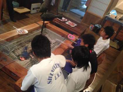 おじゃましている農家の囲炉裏です。巡回で先生方が見に行く前に自分たちで作った五平餅を焼いています。これからこの囲炉裏でバーベキューです。
