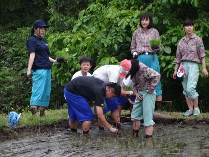 それぞれ活動がスタートしました。各宿泊先を訪問。生徒の様子を写真レポート。まずは田植え。