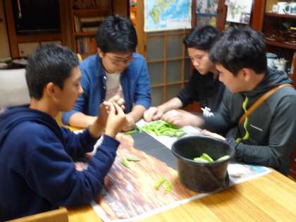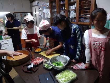 夕食の準備。今晩のメニューは?生徒たちも張り切ってお手伝い。普段家庭でお手伝いをやってますか?