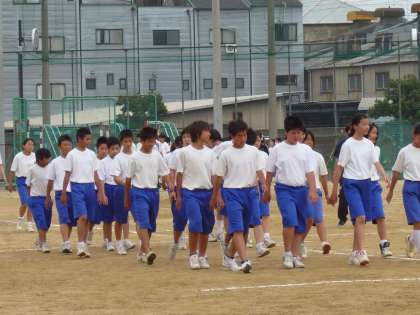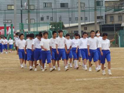 写真は、行進全体の動き、2年1組、2年2組です。