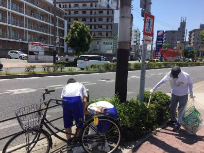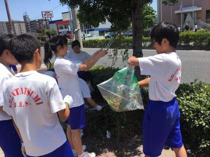 暑い中でしたが、植込みの中まで体を突っ込んでごみを取る生徒もいて、ごみ袋がパンパンになるまで清掃活動を行うことができました。