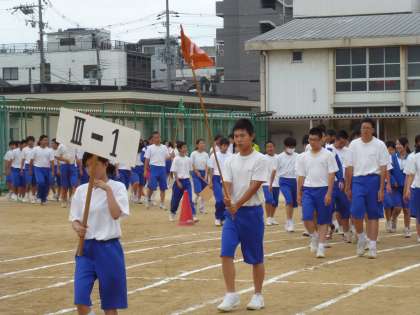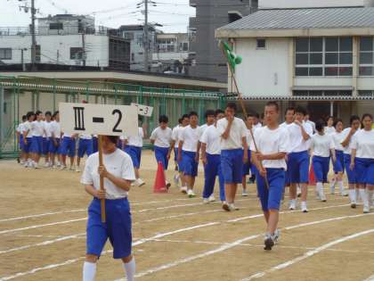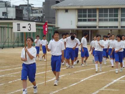 プラカードの女子体育委員、学級旗の男子体育委員を先頭に男女縦2列ずつの4列で入場門から入場です。