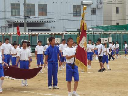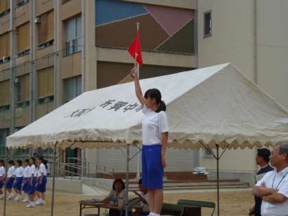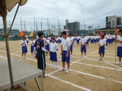 指揮台(朝礼台)の上で総指揮をしている体育委員の旗の合図で全員が動いています。