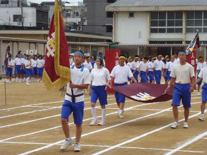 指揮台での体育委員の旗の合図で、その場足踏みから入場門を通っての入場行進の開始です。
