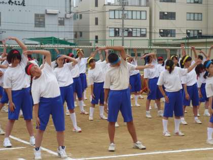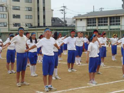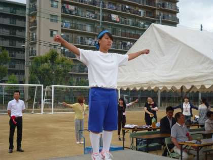 指揮台で模範演技をしている体育委員を見本に、全員が一生懸命に身体を動かしました♪