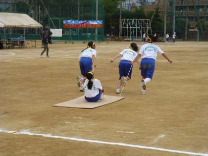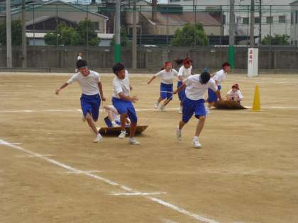 台風の目のソリ版のような競技でしたが、一人を乗せて3人が引っ張り、最後は担任の先生を引っ張って終了しました!