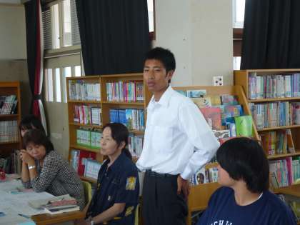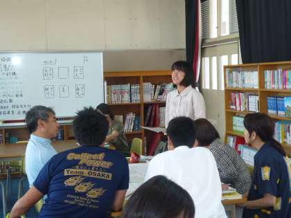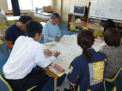 それぞれの授業グループに分かれて、図書室でワークショップ型の研究協議を行いました。