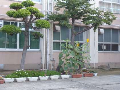 正門を入って左側の花壇にひまわりの種を7つ植えていました。