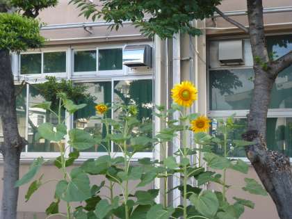 少しずつ成長していたひまわりが花を咲かせています。現在、3本に花が咲いています。もうすぐ残りの4本も元気に花を咲かせますよ♪