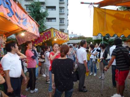 初日の7月14日(月)の夜店の様子と巽神社敷地内南側夜警テント前での集合の様子です。