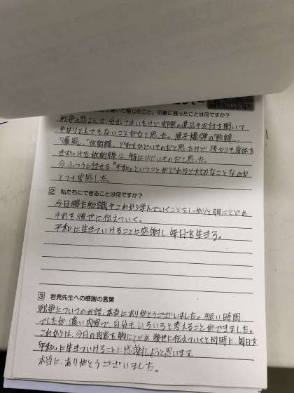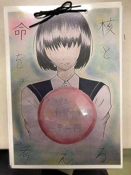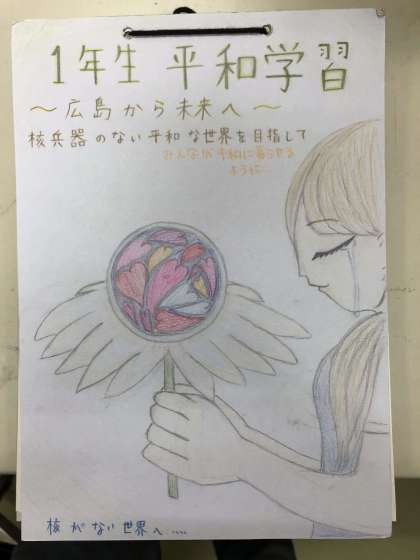 先日行った平和学習を受けて、美術部の1年生が”平和”をテーマに絵を描いてくれました。