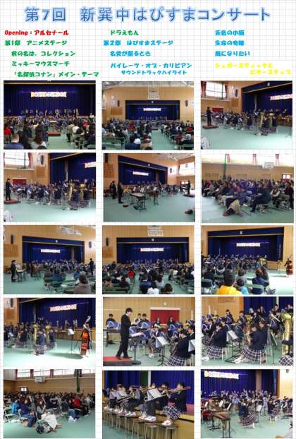 吹奏楽部のはぴすまコンサートコンサートがあった。生徒・保護者をはじめ、多くの人たちが集まった。守口市であったフェスティバルで新巽中のファンになったという人も駆けつけてくれたり、牛丸先生の恩師もコンサートに来てくれた。多くの人たちに聞きたいと思ってもらえる音に近づいてきた。来年度は関西大会、全国大会出場、そして金賞をめざしてがんばろう! こちらからも見れます⇒第7回コンサート