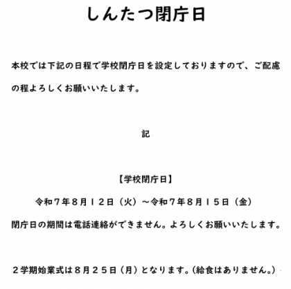また、本校では下記の日程で学校閉庁日を設定しておりますので、ご配慮の程よろしくお願いいたします。