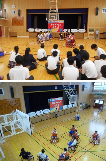 まず、デモンストレーションでは、競技用車いすのスピード感や操作性の高さと、華麗なシュートに生徒たちは興味津々でした。その後、実際に生徒と教師が競技用車いすに乗ってバスケットボールを体験。操作の難しさや、車いすバスケットボールの楽しさを肌で感じました。また真剣に取り組む友達や教師達を必死に応援していました。