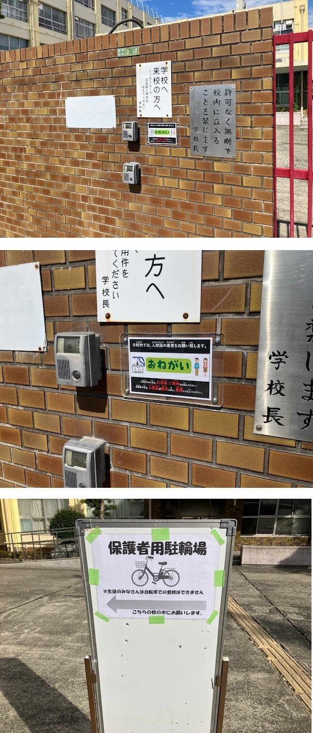 正門前に自転車を止めてしまうと、緊急車両や業者の車が入校できなくなります。