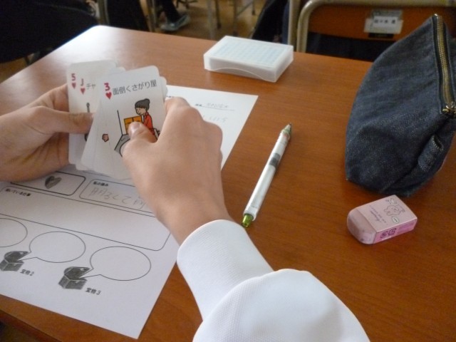 SPトランプを使用し、52枚のトランプの中から自分の性格に合っていると思う10枚のカード選び、それをもとに自分の強みや向いている仕事がわかるという取り組みです。(SPとは、サブパーソナリティの略で、自分の特性、性格をSPトランプを使って選び出し、自分の性格を分析していきます。)