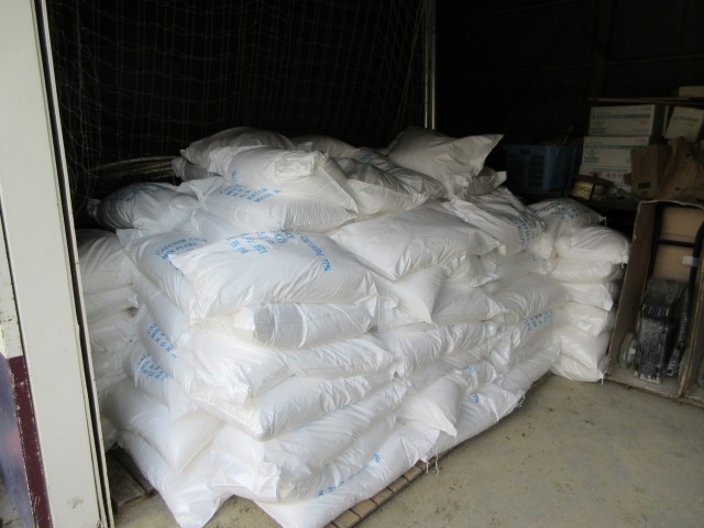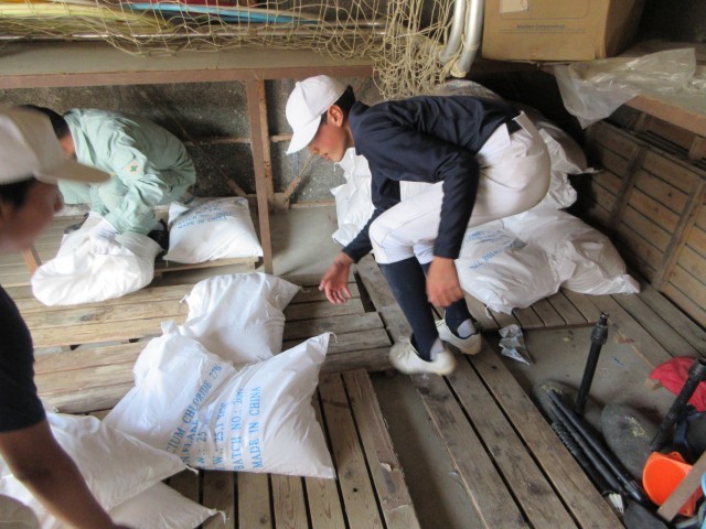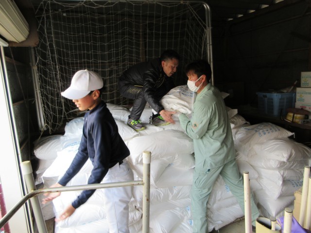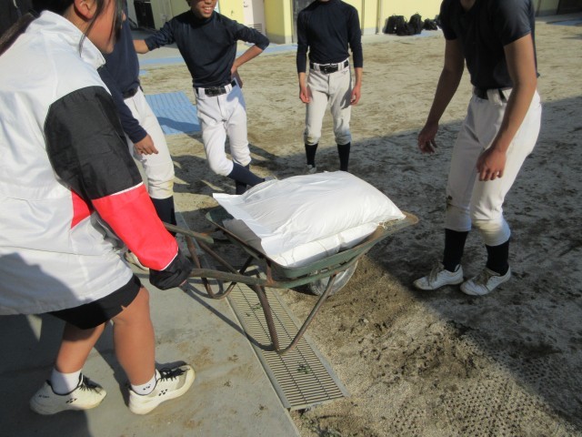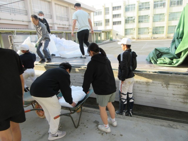 野球部、ソフトテニス部、卓球部、女子バスケットボール部の生徒が手伝いをしてくれて、倉庫に搬入しました。