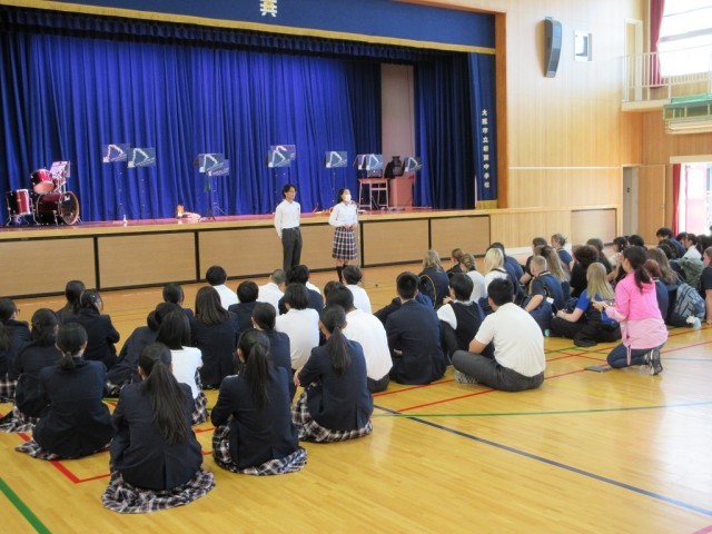 記念品の交換(ワラビーとミャクミャクのぬいぐるみの交換)の後、それぞれの代表生徒から、英語と日本語を交えながら、あいさつがありました。少し緊張した様子でしたが、しっかりと話ができました。