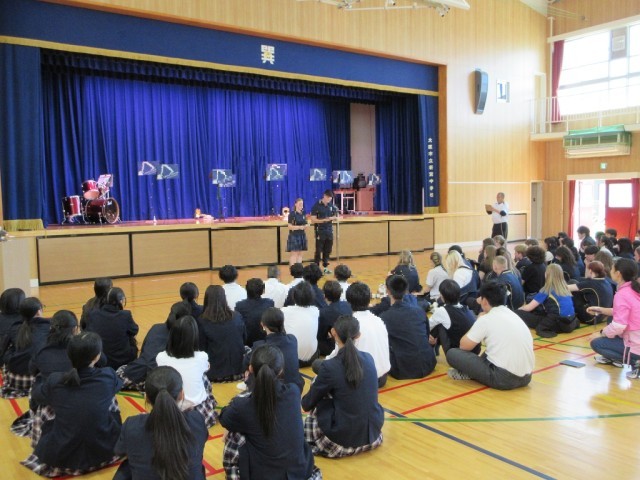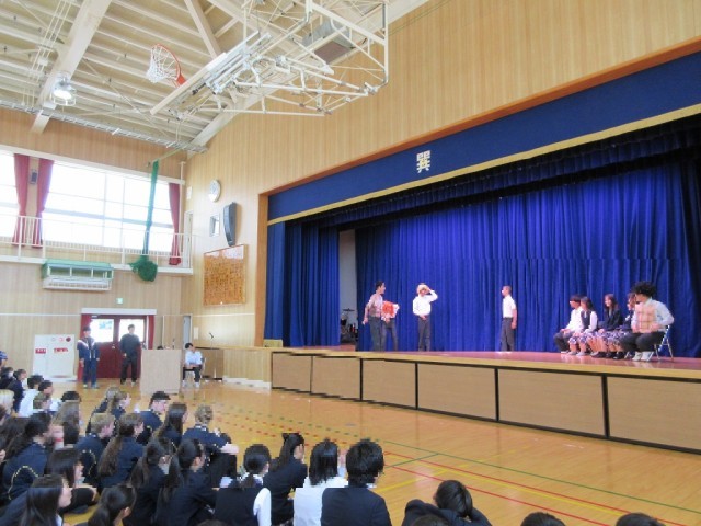 吹奏楽部の歓迎演奏、新巽中学校生徒による喜劇と続き、楽しい歓迎会となりました。