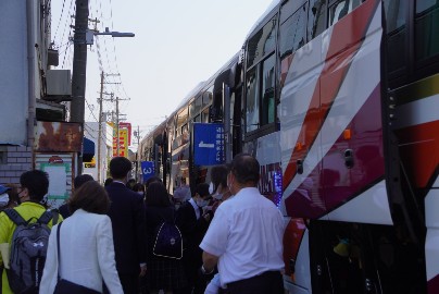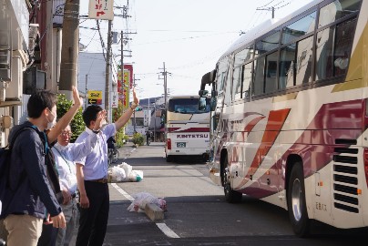 バスに乗車し、見送られ出発しました。
