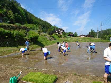 手で植える田植えの体験 1組女子の田植え風景です。