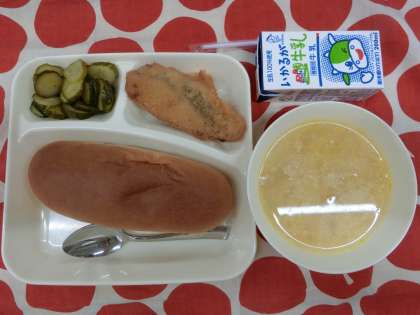 今日の給食は、「サーモンフライ、豆乳スープ、きゅうりのバジル風味サラダ、黒糖パン、牛乳」でした。