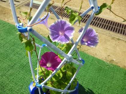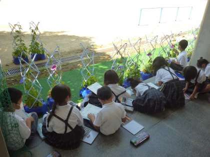 1年生が育てている「あさがお」がたくさんの花をつけています。
