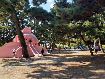 思い思いの遊具で遊んでいます。奥にある大きな滑り台は昨日の雨の影響で濡れているため、カッパを着て滑っています。