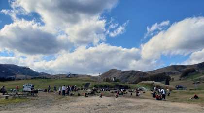 焼き板磨きの様子です。高原で広がって磨いています。炭で真っ黒になっている子もいます。