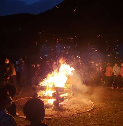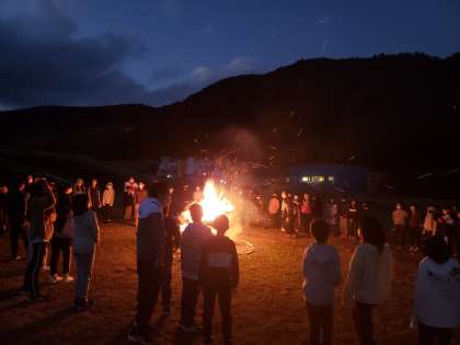 キャンプファイア、辺りは大分暗くなってきました。ファイアの炎で子どもたちの笑顔が浮かび上がっています。