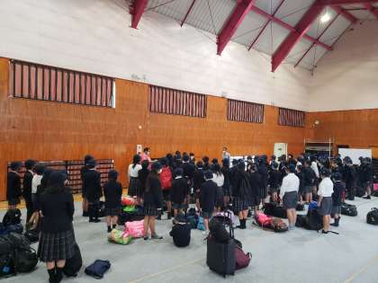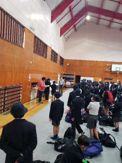 閉舎式です。屋外で行う予定でしたが、最後の最後に雨が降り始め、体育館で行っています。