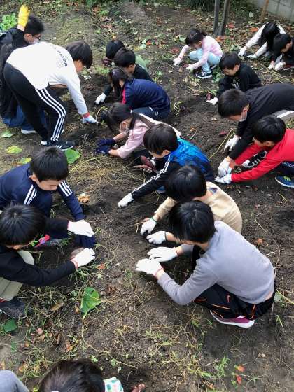 特定非営利活動法人「出発のなかまの会 松野農園」様の農園をお借りして育てていた、サツマイモを収穫しに行きました。無農薬栽培で育ててくださっていたので、畑には大きなミミズが沢山いました。土をさわったりにおいをかいだりしながら、いもほりを楽しみました。大きな芋がごろごろ出てきて、子どもたちは大興奮でした。地域の方も、学習の様子を見にきてくださいました。大きなお芋を手に「いもほりのお話を、おうちの人にするのが楽しみだなぁ」と話しながら、学校へ帰りました。